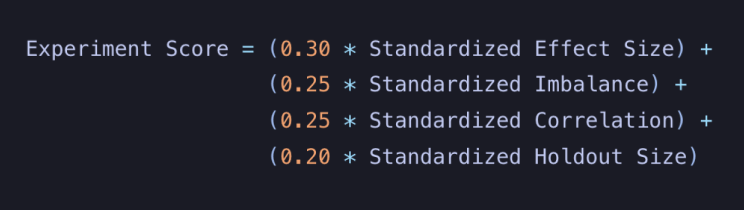Each metric is standardised to ensure they are on the same scale. The Experiment Score is then calculated using the following formula: